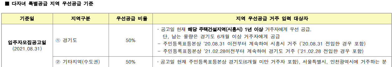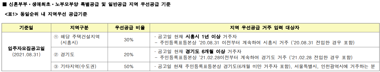 -시흥 장현지구는 대규모 지구로서 동인 순위 내 경쟁 시 해당 주택건설지역(시흥시) 거주자에게 우선공급 비율만큼 배정하여 해당 지역 거주자의 미달물량은 타 지역 거주자에게 공급합니다.