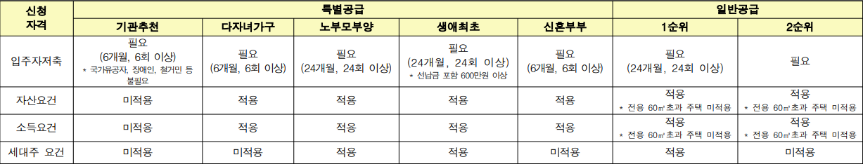 성년자인 무주택세대 구성원 (예비 신혼부부는 혼인으로 구성될 세대를 말함) 에게 1세대 1 주택 기준으로 공급 (1세대 2인 이상이 청약하여 한 곳이라도 당첨될 경우 중복청약은 모두 부적격 처리됨).