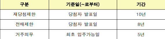 분양가 상한제 적용을 받는 주택으로 재당첨 제한 10년 적용되고, 전매제한 8년 적용 , 거주의무기간 5년 적용됩니다.