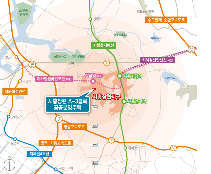 -시흥시청역, 시흥능곡역, 장곡역(예정)으로 장현지구 전체가 이미 역세권